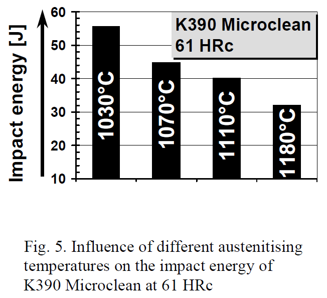Grain size is refined and carbon in solution is reduced by using the lower austenitizing temperature range; however, carbide volume is reduced by using higher austenitizing temperatures. How do those factors interact? In general, the effect of carbide volume is less than the effect of grain size and carbon in solution. Perhaps this is due to the largest carbides still being present with high austenitizing temperatures as was shown in the Vanadis 4 images. Therefore, a lower austenitizing temperature usually leads to superior toughness, as can be seen with K390 that was all tempered to the same hardness [9]: