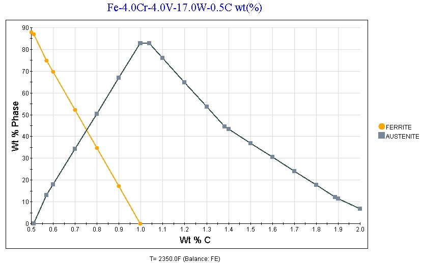 The higher vanadium content would lead to a loss of carbon in solution in austenite, and also lead to ferrite present even at high temperature, as vanadium is a ferrite “stabilizer.” If the steel does not fully transform to austenite then it cannot transform to the hard martensite phase and instead has relatively soft ferrite; I covered this in part in Austenitizing Part 1 and What Makes Quenched Steel so Hard? This effect of vanadium is confirmed with thermodynamic calculations using JMatPro for a similar composition, where the replacement of austenite with ferrite can be seen: