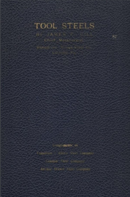 One more piece of fun history: my copy of the book is signed to A.G. McKenna in the front cover. The McKenna family was made up of metal workers, metallurgists, and business owners. The company Kennametal continues today. A.G. McKenna played a role in the early development of tungsten-alloyed high speed steel and T1, and this led to the founding of VASCO. In his thesis, James P. Gill claimed that A.G. McKenna was publishing articles about high temperature heat treatment even before Taylor and White, though he provides no citations for this. A.G. McKenna was never officially an officer of VASCO but his brother Roy McKenna became president of VASCO in 1915 [15], and the second edition of Tool Steels was dedicated to Roy. Whether A.G. McKenna asked for a copy of Tool Steels or if Gill signed it and gave it to him is probably impossible to determine now. I don’t know how it ended up on Amazon and sold to me. The inside cover lists the book as having been donated by David Earl McDaniel to the San Jose public library. I contacted the library and they told me that McDaniel was a poet and singer who collected thousands of books and donated them all to the library. Unfortunately he died in 1977, unmarried, and kept no records of where he got the books.