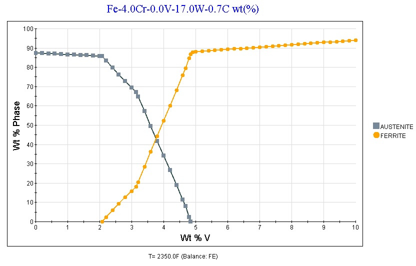 You’ll notice that in the article the reason for the drop in hardness was that ferrite was retained at high temperature so that the steel cannot be fully austenitized. The 17% tungsten has something to do with that because tungsten is a “ferrite stabilizer.” Also while the study cited is for 0.64-0.8%C, that means they were targeting approximately 0.7%C and carbon is a very strong “austenite stabilizer” so small differences in carbon matter. So 3V has slightly higher carbon, and a lower overall content of “ferrite stabilizing” elements with its 7.5%Cr and 1.3%Mo. So you get a plot at 1950°F for vanadium vs ferrite that looks like this: