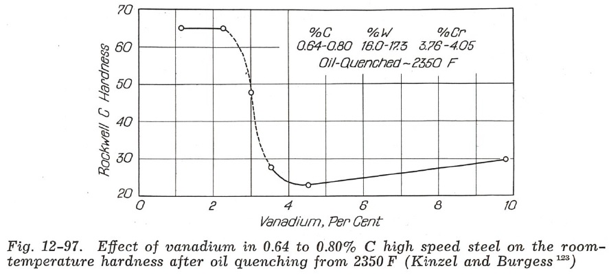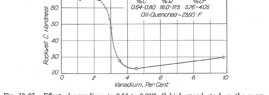 Kinzel and Burgess found that for every 1% increase of vanadium beyond the standard T1 composition an extra 0.2% carbon was necessary so the steel could be fully austenitized and therefore achieve full hardness after quenching. They found a “preferred composition” of 1.5% carbon and 5% vanadium which is approximately the same as T15 high speed steel which was developed over a decade later. Surprisingly, the effect of vanadium at that time was not known; Kinzel and Burgess proposed that perhaps it was due to 1) grain refinement or 2) enhanced solubility at high temperature so that precipitation strengthening is enhanced. The high hardness of the vanadium carbide contributing to wear resistance was not mentioned.