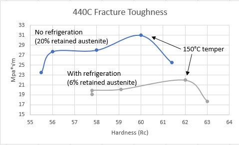 It is very common for custom knifemakers to use cryogenic processing of their steels which eliminates most of the retained austenite in the steel. I wrote a forum post about what retained austenite is and what cryo treatments do. Toughness testing usually shows an increase in toughness with greater retained austenite, as can be seen in this figure for 440C [5]: