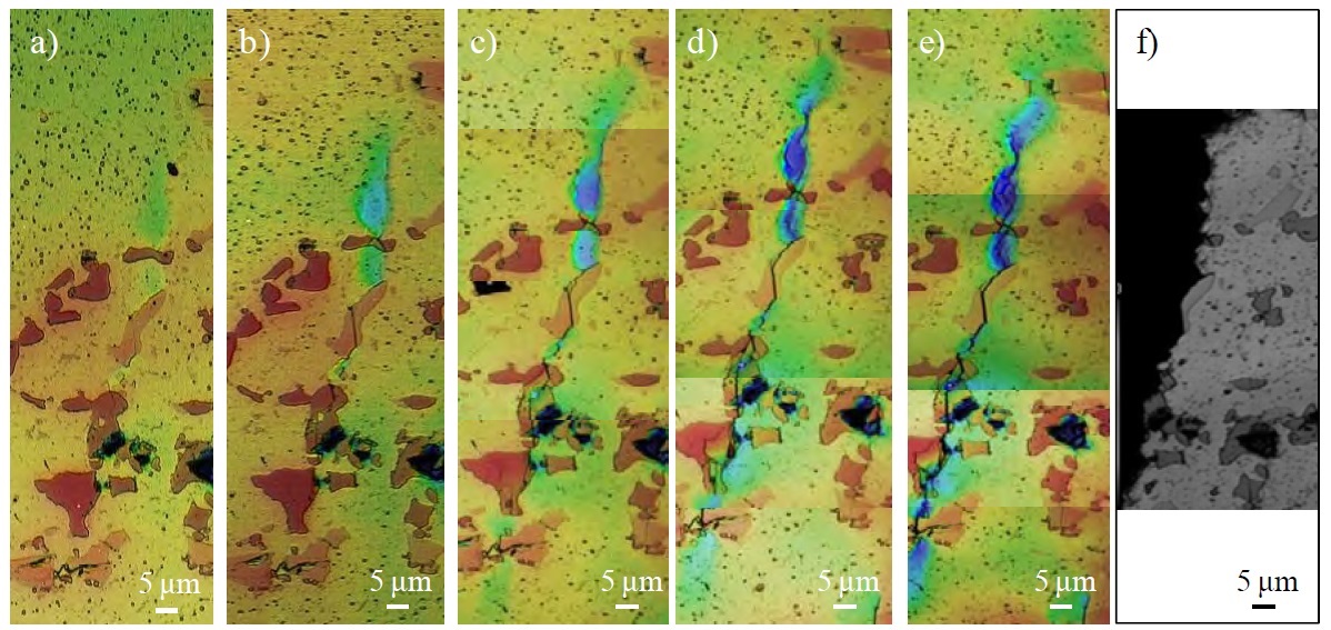 From that figure it can be seen that the steel with retained austenite had both a higher ΔKTH (stress intensity required for crack growth), and at high ΔK approaching KC (low-cycle fatigue and fracture toughness) the resistance to fatigue is better. The behavior in the steady crack growth region is similar between the two. During crack growth there is stress on the surrounding austenite and it transforms to martensite. Martensite is a larger phase (less dense) than austenite and therefore during the transformation the expansion from the transformation leads to “plasticity-induced crack closure.” A stress applied to the crack closes it and therefore the stress required for crack propagation is greater. A micrograph showing a crack growing within a ferrite (red)-austenite (green) microstructure is shown below, where transformation of the austenite to martensite can be seen around the crack (green austenite becomes black martensite) [14]: