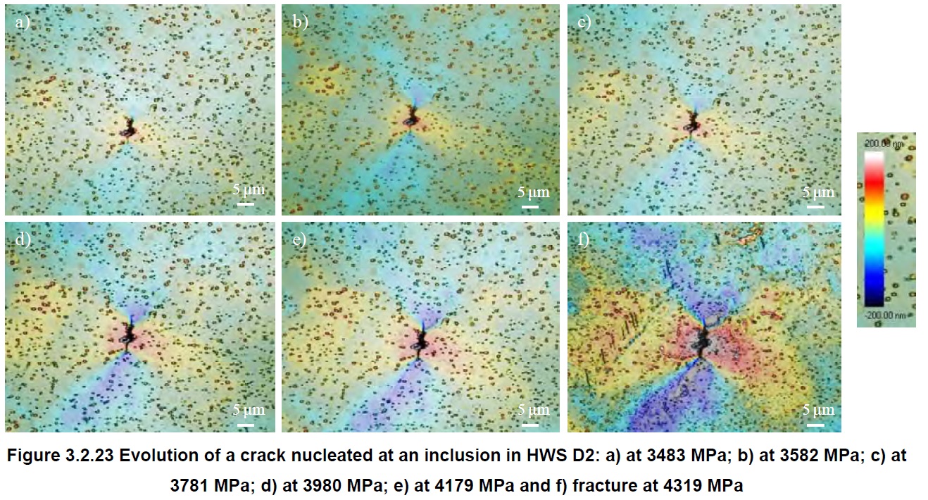 However, cracking of carbides was not seen in the HWS powder metallurgy steel, but instead the cracks initiated at impurities because they were larger than the carbides, and therefore the stress required for cracking at impurities was lower than for carbides. The stress required for crack initiation was still much higher than that required for D2, however, on the order of 3400-3600 MPa [7]: