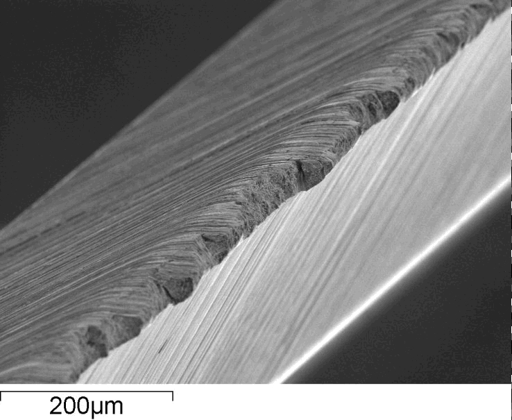 Micro-chipping is on a “micro” scale meaning that the chips are often not visible to the naked eye but require magnification. Therefore, micro-chipping is usually perceived as a loss of sharpness rather than obviously visible chipping. The short growth and linking up of carbides occurs through crack initiation at carbides and then growth through low-cycle fatigue.