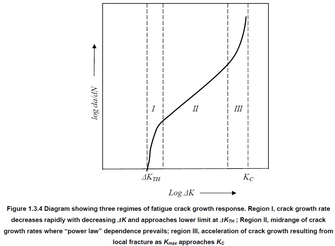 Below a certain number of cycles, the material reaches a region of “low-cycle” fatigue (high stress) rather than “high-cycle” fatigue (low stress), usually the cutoff point is given as 1000 or 10000 cycles, so failures in knives are almost always in the low-cycle fatigue regime. Typically low-cycle fatigue is at sufficiently high stress levels where small amounts of yielding (permanent deformation) occurs. Micro-chipping and chipping of edges occurs in the low-cycle fatigue region [7]. Low-cycle fatigue is more greatly controlled by toughness and less by the slow crack growth dominated by high-cycle fatigue [8]. This can be understood through analysis of the effect of ΔK on crack growth [7]:
