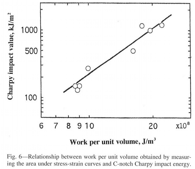 One of the reasons that charpy v-notch and fracture toughness are highly correlated is because the presence of the notch in the charpy specimen greatly reduces the energy required for crack initiation. However, in the case of unnotched samples the situation is somewhat different because there is no stress riser for lowering the energy required for crack initiation. This makes unnotched testing somewhat more variable because the crack can initiate anywhere over a certain distance because there is no notch. However, this also means that the effect of crack initiation on fracture is better captured by unnotched specimens, or gentle notches like c-notch or u-notch. Because unnotched or c-notch charpy testing incorporates both crack initiation and propagation, it correlates much more strongly with the area under a tensile curve [5]: