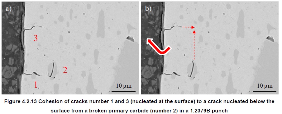 Larger carbides require less applied stress to crack than smaller carbides. In a comparison between conventionally cast 1.2379 (D2) steel and a powder metallurgy steel HWS it was found that the stress required for crack initiation was vastly different (note difference in magnification) [7]: