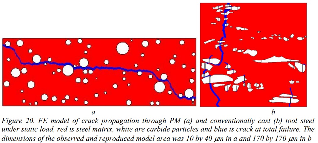 In testing of shearing dies operated by trimming of high strength sheet steel, it was found that the HWS PM steel did not have superior fracture resistance to D2 steel when in the presence of large initiated cracks, and they attributed this to the ease in crack propagation of the PM steel despite its resistance to crack initiation. Another conventionally cast steel with a lower carbide volume, however, showed superior resistance to fracture due to its higher fracture toughness from a small carbide volume combined with a relatively large average distance between carbides. In the presence of small cracks which lead to micro-chipping, superior behavior was found in the PM steel. Therefore, the type of loading and use of a knife edge is important in determining which steel will show superior behavior. They concluded that the PM steel was better for short cracks and high stresses while the D2 was better at resisting crack propagation of large cracks. Similar results were found in a comparison of four different PM steels with similar carbide volume but different carbide size distributions. The PM steel with the largest carbides and highest hardness was found to have the best fracture toughness because the distance between carbides was greatest [10]: