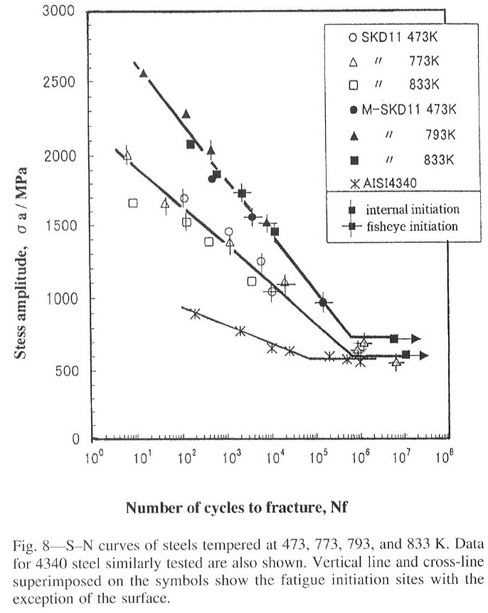 In a study comparing D2 (SKD11) with a modified steel with lower carbon and chromium for lower carbide volume and smaller carbides (M-SKD11), they found that with low-cycle fatigue the stresses allowed were much higher with the lower carbide volume steel: