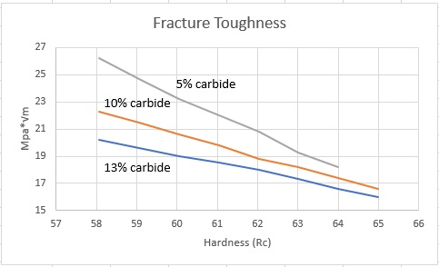 I am looking at the chart fracture toughness vs hardness. Each curve (5, 10 and 13% carbide) are going toward lower K1C when HRc increases. This can only go with the size and distribution of carbides as percentage is constant. There should be fine (and plenty of it) particles on one side (the hard side?) vs a few big chunks of carbides. But if fine particles are on the hard side, it should mean higher K1C.
