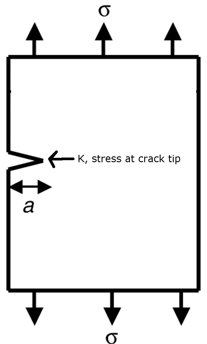 An important measure of toughness is the resistance to fracture in the presence of a pre-existing crack. This is important because most parts in service have some level of imperfection to them. For example, a knife edge sharpened to rougher finishes will have larger scratches than a finely sharpened edge, and these scratches can be thought of as pre-existing flaws [1]: