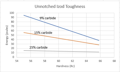 Higher carbide volume has also been found to lead to lower fracture toughness and lower impact toughness as measured by charpy or izod. Therefore a lower carbide volume improves resistance to both crack initiation and crack propagation. Higher hardness also reduces both fracture and impact toughness, and the effect of carbide volume becomes smaller at high hardness [12][13]: