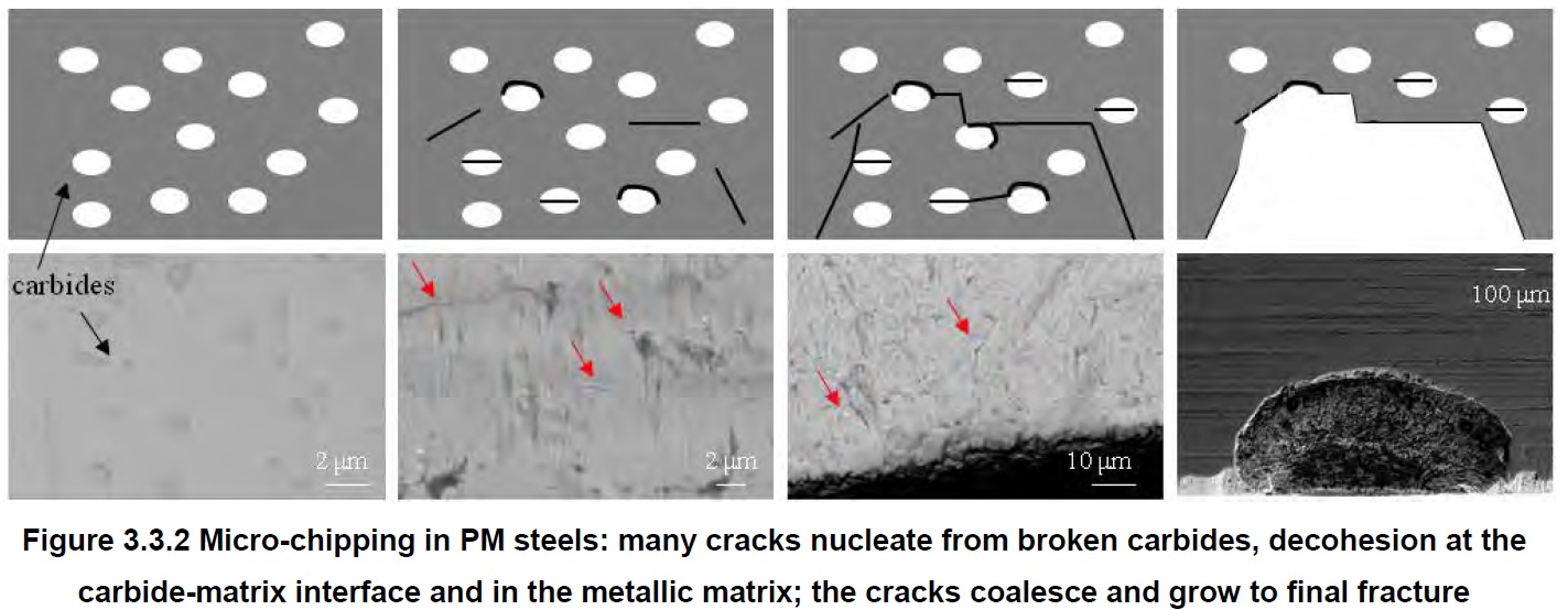 ” Larger carbides, a greater volume of carbides, and segregation of carbides all increase susceptibility to chipping. Hardness, grain size, and retained austenite all affect toughness and therefore the crack formation, propagation, and chipping and micro-chipping in addition to the carbides. ”