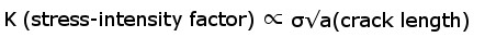 Fracture is measured in terms of K, or “stress-intensity factor” which is the stress at the crack tip. K is proportional to the stress and the square root of the size of the flaw. Therefore a larger flaw means that less stress is required to cause fracture: