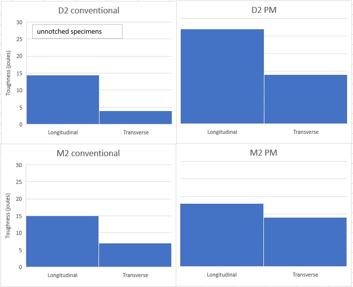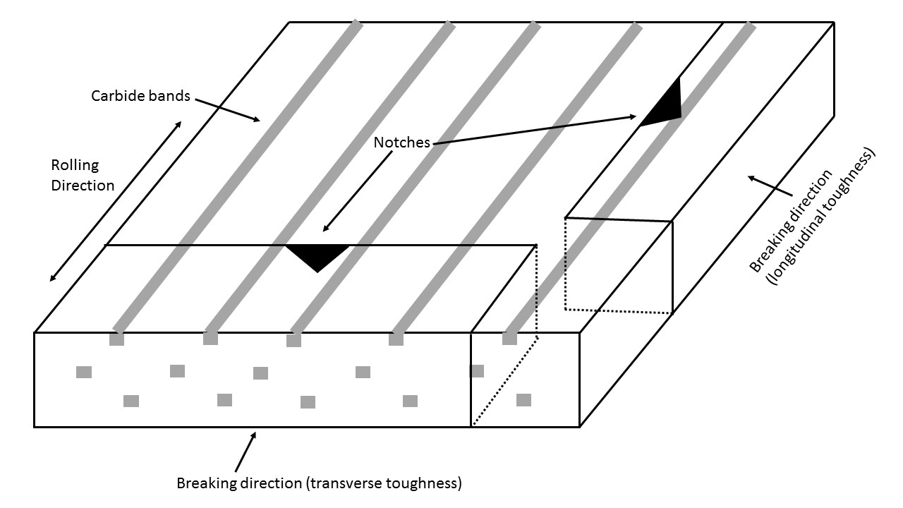 With the transverse toughness specimen the notch and the breaking direction are aligned with the segregated carbide bands. Therefore the crack can grow along those bands of carbides and the toughness with transverse specimens is lower when compared with longitudinal specimens. Powder metallurgy helps to reduce carbide segregation and therefore improve transverse toughness but has a smaller effect on longitudinal toughness [16]: