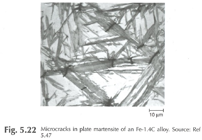 Another major source of embrittlement with high carbon steels is “plate,” rather than lath, martensite. There is a transition above about 0.6%C where these plates of martensite form instead which are much more brittle than lath martensite, in part because of microcracks that form: