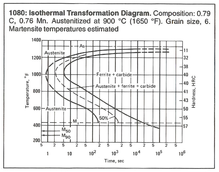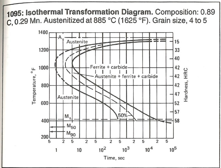 I was mostly not thinking about lowering the austempering temperature. If you look at the difference between the two carbon levels in 1095, the 1.13%C verson attained 60hrc all the way up at 500f, which is two points higher than the 0.89%C version gets down at 400f — and in half the time. Austempering down at Ms will give you a higher hardness for a given level of carbon, but the time scale shoots up very quickly. Holding a fixed higher temperature (say 500f) still seems to take longer with higher carbon, but by a much more reasonable factor of two rather than a factor of ten (at least, in this one case..).
