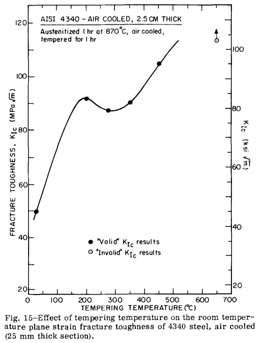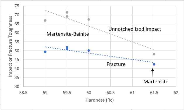 Therefore martensite has to be tempered down to the same hardness level as the bainite to realistically compare properties. Unfortunately, the degree of tempering required often puts the steel into the “tempered martensite embrittlement” (TME) region around 450-650°F where toughness is reduced [8]: