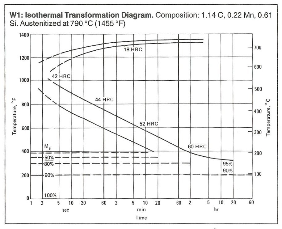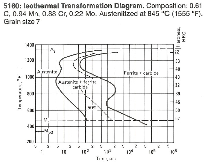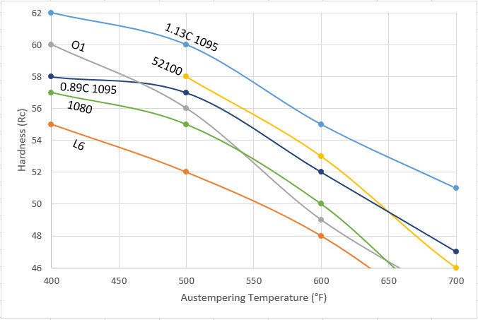 * In your “hardness vs austempering temperature” plot, 52100 maxes out at 58hrc@500f. This looks like it’s based off of the TTT from “heat treaters guide”. In Verhoeven’s book, he shows 60hrc@475 at a very similar austenitizing temperature, which is a pretty steep departure from the rest of the curve. Is this likely due to slight differences in the exact composition, or just uncertainty in hardness measurements, or something else?
