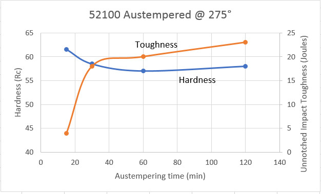 The introduction of about 20% softer bainite has been found to lead to higher strength than 100% martensite [18], because as the bainite forms within austenite carbon diffuses out of the bainite in the remaining austenite as it forms which increases the final strength of the martensite. This led to the peak in hardness at about 30 minutes, as this would correspond to about 20% bainite, with the remaining microstructure being untempered martensite. With increasing time at austempering temperature more bainite was formed for lower hardness. However, this peak in hardness and toughness has not always been reproduced, as is shown with another study on 52100 with a similar austempering temperature of 275°C [19]: