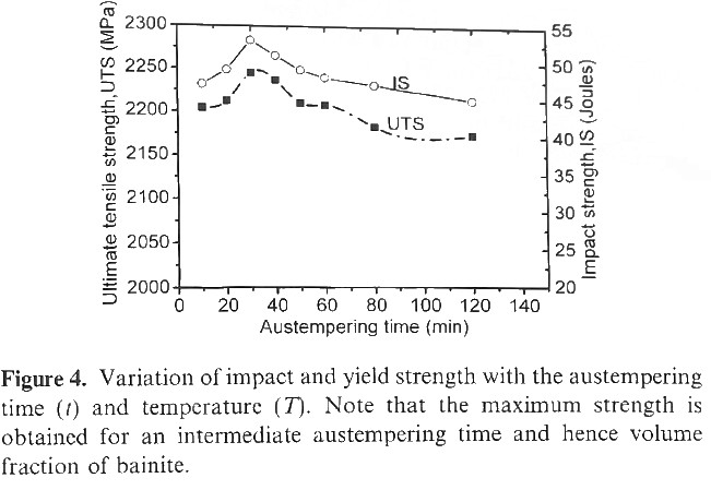 In some cases superior properties have been found by having a combination of both lower bainite and martensite. Here is an example of 52100 austempered at 270°C (518°F) for different times, where there is a peak in both strength and toughness at about 30 minutes which gives some bainite (formed during the hold) and some untempered martensite (formed after cooling to room temperature following the hold) [17]: