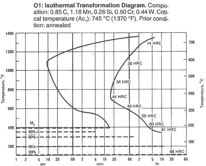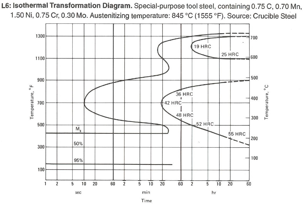 A2 with its 5% Cr or D2 with its 12% Cr are designed to have just under 0.6% carbon in solution to avoid plate martensite and excess retained austenite. So even though these steels will not form bainite in a reasonable time with their high alloy content, it probably doesn’t matter because they are not usually forming plate martensite anyway. Simple carbon steels such as 1080 and 1095, however, are in danger of forming plate martensite. The likelihood of forming plate martensite can be reduced through the use of lower hardening temperatures [15], though that is easier to accomplish with a digitally controlled furnace rather than the commonly used forges with simple carbon steels.