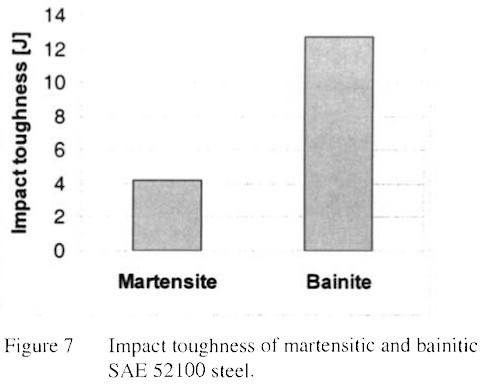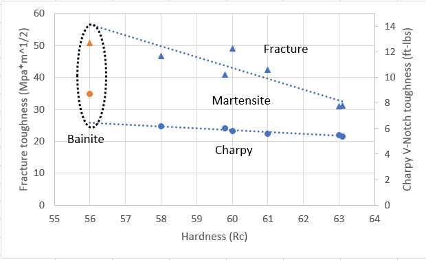 Verhoeven in his book [6] originally written for bladesmiths reported that his review of the literature revealed that bainite shows greater toughness than tempered martensite at hardnesses greater than or equal to 50 Rc. He did not provide any explanation as to why. Sometimes extreme differences in toughness between bainite and martensite have been published [7]:
