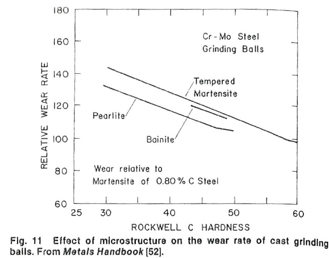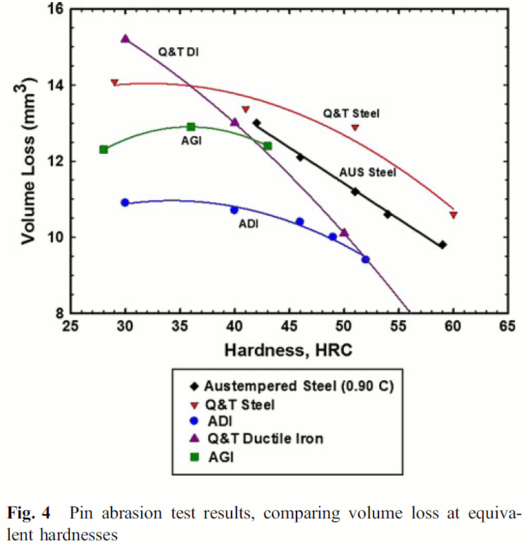 Some studies have shown bainite having a small advantage over tempered martensite in wear resistance at a similar hardness [23][24][25][26], generally due to either a higher fraction of small carbides vs the tempered martensite or due to retained austenite. The number of studies looking at abrasion resistance rather than the less useful sliding wear resistance is small, however, and the carbides and retained austenite are both affected by the type of austempering treatment and composition of the steel. Under sufficiently high pressure the retained austenite transforms to fresh martensite and this transformation increases wear resistance. Retained austenite is often undesirable in knives, so an improvement due to retained austenite may not be beneficial overall for a knife. However, there may be an effect of the carbides or lower bainite microstructure itself. The figures below have some variation in how they represent wear resistance; however, in all cases higher hardness means better wear resistance, so that is the key to interpreting them.