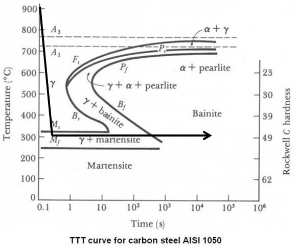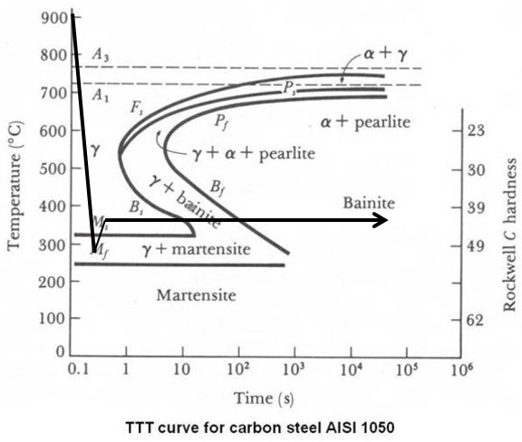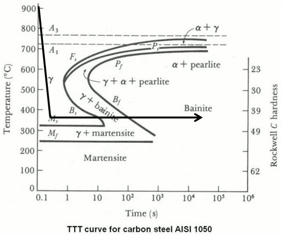 Why spend so much time on martensite formation if this article is supposed to be about bainite? The two share similar features. Bainite is almost like directly forming tempered martensite. The TTT diagram shows that to form bainite we quench to an intermediate temperature and hold rather than directly to room temperature: