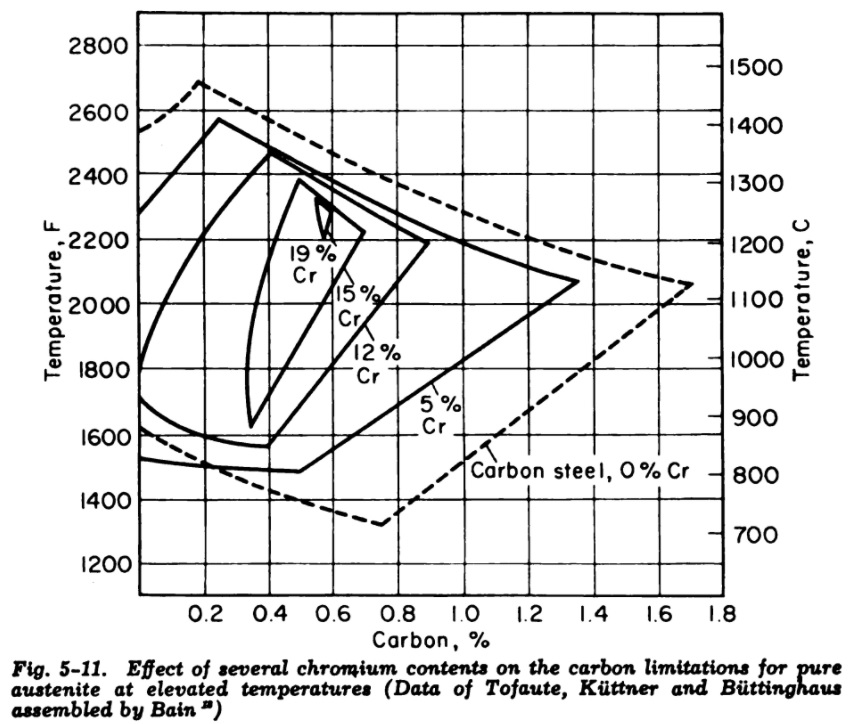 Will all high carbon steels have relatively poor toughness with a tempered martensite microstructure? You may be looking at the composition of some tool steels with >1.5% carbon and wonder why anyone is even using them. Well, with alloy additions the carbon content of the austenite, and therefore the final martensite, is reduced. For example, here is a diagram showing how the “eutectoid” carbon concentration is reduced with increasing chromium additions: