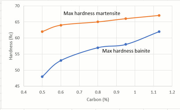 * In your “hardness vs carbon” plot, it shows the hardness for bainite and martensite both increasing monotonically with carbon content, but there are no data points beyond 1.13%. The obvious question that sprints to mind is “what if we kept increasing the carbon content?”. If I understand correctly, the answer for martensite is that retained austenite becomes increasingly problematic, and eventually even cryo isn’t enough to help. Does the same thing happen to prevent people from making 63hrc+ bainite just by upping the carbon content? I don’t have a good understanding of why that may or may not happen. Sometimes retained austenite can convert to bainite during tempering, which makes me think “no”, but sometimes it’s just “stabilized” which makes me think “yes”. I haven’t yet found a good explanation about how to determine which is going to happen.
