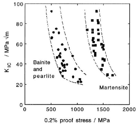 However, even the very highest carbon bainite still forms laths, not plates, and so this embrittlement does not occur for bainitic microstructures. The study which Verhoeven cited for improved toughness of bainite looked at steels with sufficient carbon to form plate martensite, up to 0.85%C. And the superiority of bainite increased with increasing carbon content. This increasing gulf in properties with increasing carbon content likely indicates that it is plate martensite that is reducing the toughness of martensitic steel. Studies with low carbon steels as show tempered martensite has better toughness than bainite, and it is steels above about 0.5%C that show superior behavior of bainite rather than the cutoff being hardness as Verhoeven described [11][12]: