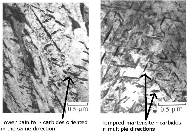 Sometimes it is so difficult to differentiate between lower bainite and tempered martensite that high resolution electron microscopy is required to see the orientation of the fine carbides to differentiate the two. So if they are both lath-like phases with small carbides inside and can be difficult to tell apart, why would we expect there to be a difference in properties?