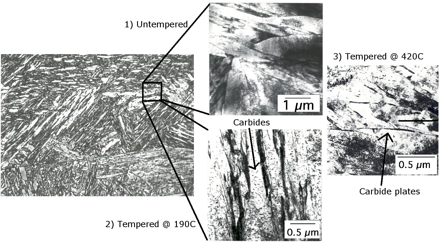 Then the steel is reheated to a low temperature for tempering where small carbides come out, and are replaced by larger carbide “plates” at higher tempering temperatures [1][2]:
