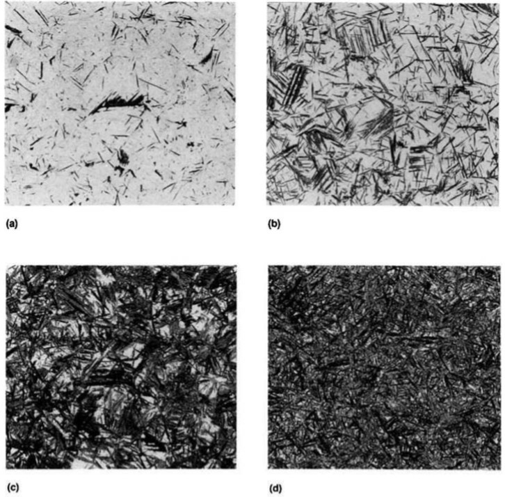 On a broader scale you can see the formation of lower bainite in a 1080 steel with increasing time at 300°C, from 70s (a), 200s (b), 800s (c), and 2000s (d) [5]: