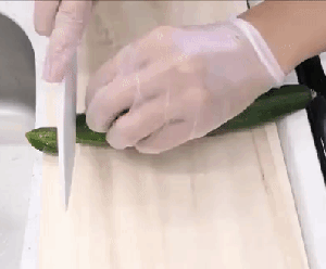 In most videos he ends it by cutting cucumber with the newly completed knife. The cucumber is often found in unusual places: