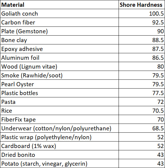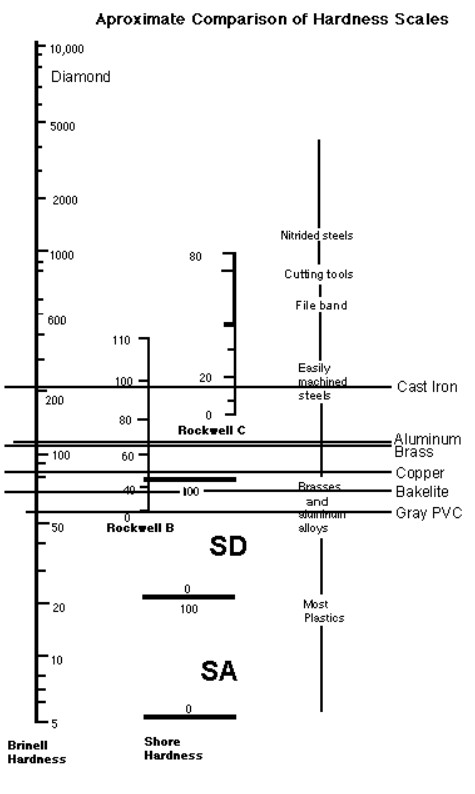 The Shore D scale doesn’t overlap with the Rockwell C scale (see “SD” below), though there may be less reliable readings at the top end of the Shore scale (~100). Therefore in general these materials are much less hard than the steels we generally use in knives: