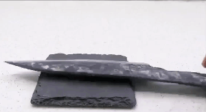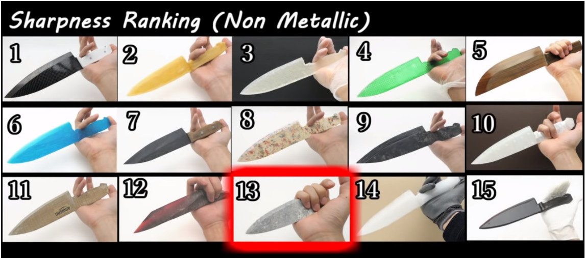 There are more complex material properties to discuss about the various choices, but would probably lead into too many directions, and there isn’t much information out there about the material properties of dried jello. For example, carbon fibers individually are strong, but are used in a composite with many fibers along with another material such as epoxy or other polymers. Because it is a composite of carbon fiber and epoxy, the hardness measurement is a composite measurement of both the epoxy and many different fibers, which is much lower than the strength of an individual fiber. When used as a knife the composite properties add up to a knife material that isn’t superior to steel.