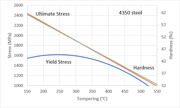 This increase in yield stress is seen with tempering temperatures up to about 250°C (482°F). Over this low tempering temperature range, hardness and ultimate stress is reduced but yield stress actually increases, as seen here with 4350 steel [11]: