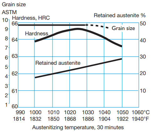 When steel is heat treated it is heated up to a high temperature where a phase called austenite is formed, followed by quenching the steel rapidly to form the hard phase called martensite. In certain cases a certain amount of austenite is “retained” after quenching. Learn more about quenching and retained austenite in this article. Retained austenite is much softer than martensite. Higher austenitizing temperature generally means higher hardness because more carbides are dissolved and more carbon is in solution to strengthen the martensite. However, higher austenitizing temperature also means more carbon and alloy in solution which stabilizes more retained austenite. Therefore at a certain point the hardness no longer increases with higher austenitizing temperature but decreases because of excessive retained austenite, such as in this example with Uddeholm Caldie [7]: