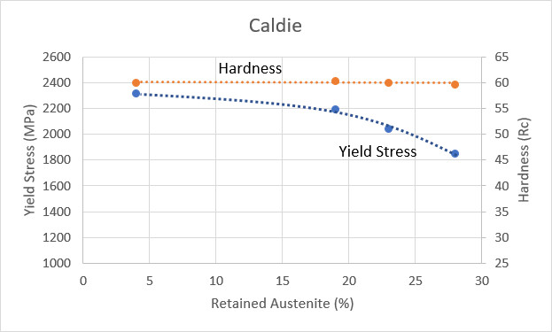If excessive retained austenite is formed and the hardness is somewhat reduced vs the target, the knifemaker may reduce the tempering temperature to maintain the same hardness as when the optimal austenitizing temperature is used. However, the yield stress is changed by the retained austenite content as well [8]: