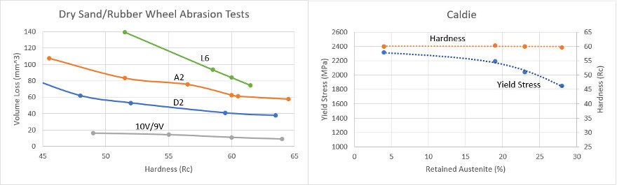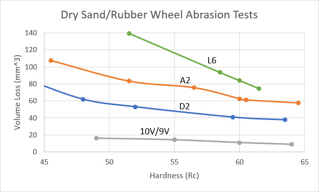 Higher hardness increases wear resistance [2][3][4][5]. However, just like toughness the carbides cannot be ignored. The high hardness of carbides leads to improved wear resistance even when the steel may be at a lower hardness. Wear resistance correlates with slicing edge retention. Therefore, hardness should not be used as a proxy for wear resistance. L6 is a low alloy steel with relatively soft iron carbides (cementite). A2 and D2 contain harder chromium carbides but D2 with its 15% carbide is more wear resistant than A2 which has about 1/3 as much carbide. 10V and 9V have a similar amount of carbide as D2 but have the much harder vanadium carbide for better wear resistance. Cementite is about 1000 on the Vickers hardness scale, chromium carbide 1500 Hv and vanadium carbide 2800 Hv [6]. Note that in the plot below lower is better.