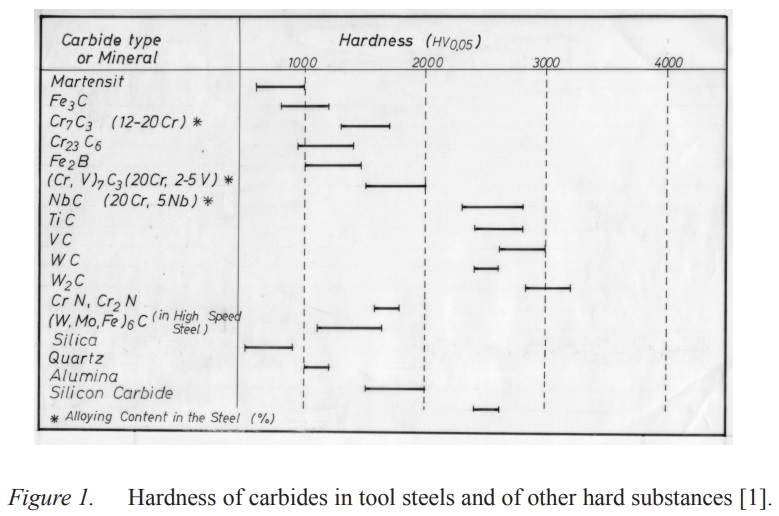 2. Carbide hardness. Harder carbides, just like harder steel, are more resistant to wear. Here is a chart showing different steel carbide types with their range of hardness. Low hardness carbides include iron carbides (Fe3C cementite) in simple carbon steels, intermediate hardness carbides include chromium carbides (Cr7C3 and Cr23C6) and molybdenum and/or tungsten carbides in high speed steels (M6C where M is either Mo or W), and high hardness carbides formed from vanadium, niobium, or titanium (MC where M is V, Nb, or Ti).