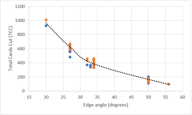 While it isn’t possible to compare tests on one steel with a 55° edge angle with another that has a 20° angle, within a give edge angle there is certainly an effect of steel and/or heat treatment. For example, looking only at 30°, there is a range of total cardstock cut (TCC in mm) from about 180 all the way to 850. It is apparent that the difference between the high wear resistance and the relatively low wear resistance steels increases with lower edge angles. In other words, if a very obtuse edge is used then even the “super” steels don’t cut very much cardstock.