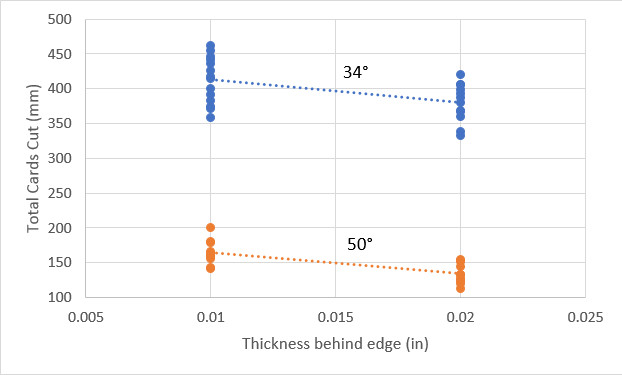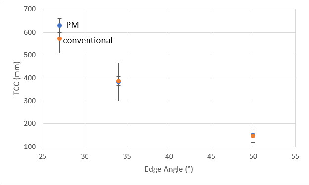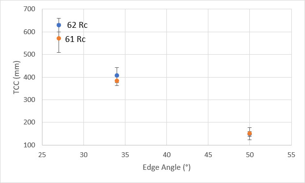 Similar to the previously published 154CM study, a strong effect of edge angle was also seen in this broad set of tests: