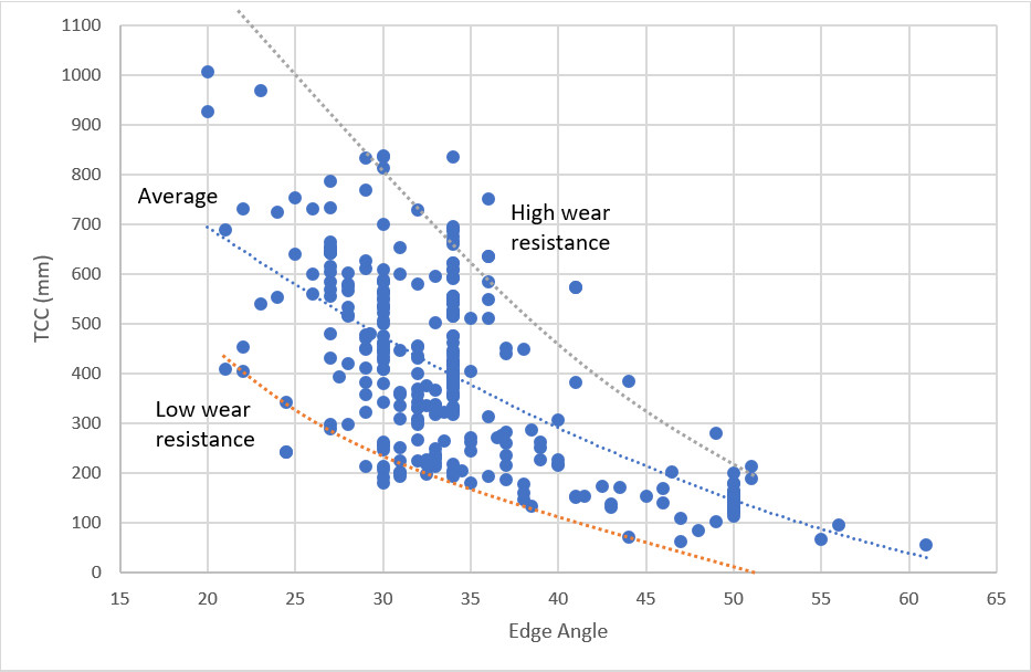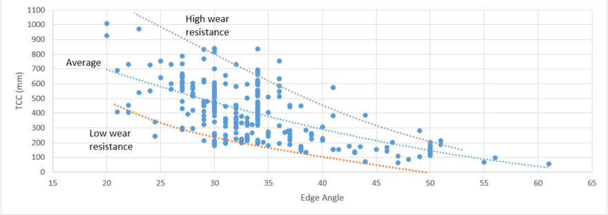 TCC (mm) = -157 + 15.8*Hardness (Rc) – 17.8*EdgeAngle(°) + 11.2*CrC(%) + 14.6*CrVC(%) + 26.2*MC(%) + 9.5*M6C(%) + 20.9*MN(%) + 19.4*CrN(%)