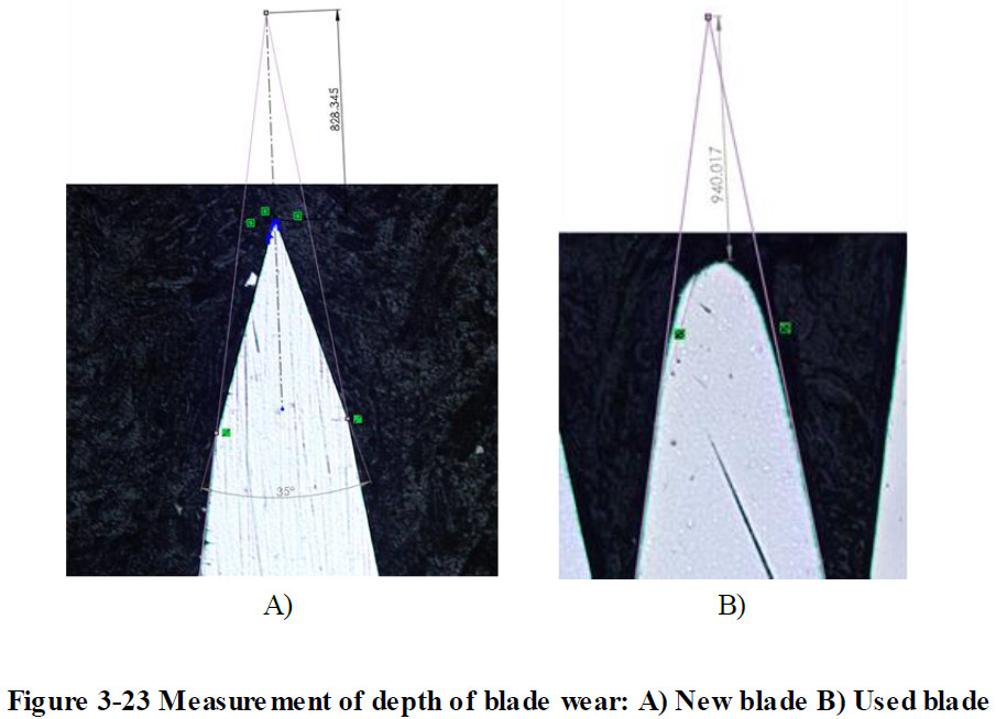 Cutting ability is the overall energy required for completing a cut, while sharpness is the energy required for cut “initiation” which correlates strongly with the edge tip width or radius. Higher sharpness increases cutting ability. Lower edge angle or thickness behind the edge increases cutting ability independent of sharpness. You can read more in this article on sharpness vs cutting ability. The CATRA edge retention tester measures cutting ability, not sharpness. So while the cutting ability is reduced throughout the test by a reduction in sharpness, it is not actually measuring sharpness. This is important when comparing tests with different edge angles as the cutting ability is different independent of sharpness. You can see the change in edge tip radius/width with sharpness loss below [4]: