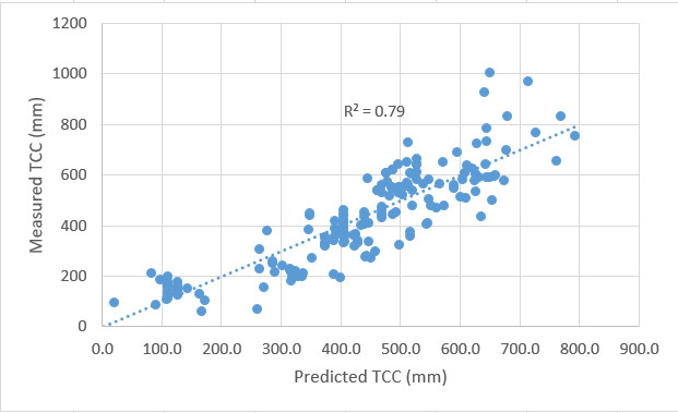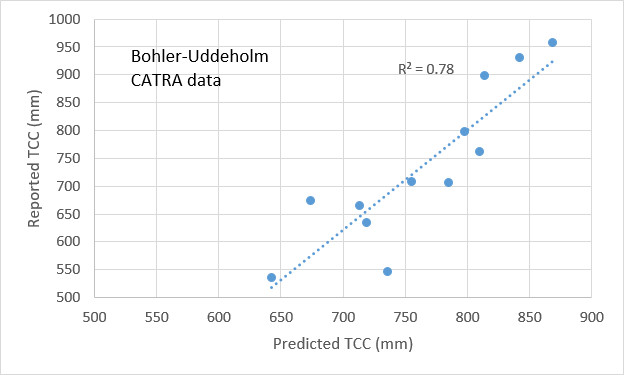A good test of a regression equation is to use it on an independent dataset, so here I plotted the predicted TCC for each of the steels tested by Bohler-Uddeholm [18] compared with the reported values: