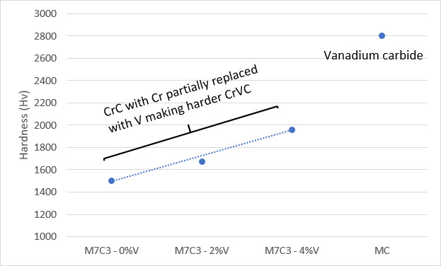 Another important factor that is difficult to plot on a simple chart is the effect of other elements on certain carbides. For example, when vanadium is added to a high chromium steel, instead of a simple Cr7C3 carbide, some of the Cr is replaced by V and M7C3 carbide is formed instead where the M can be either Cr or V. I refer to these as CrC and CrVC in this article for simplicity though those are not technical terms. When the Cr is partially replaced by V then the hardness of the carbide is increased though not to the extent of a “pure” VC carbide. The chart below shows the change in hardness of CrC (M7C3) with vanadium content of 0, 2, and 4% where the hardness of M7C3 increases with vanadium content. This is important with steels like S60V, Elmax, or M390 where the very high chromium content means very little actual VC carbide is formed but the vanadium increases the hardness of the chromium carbides. Here is a figure showing the effect of vanadium on the hardness of chromium carbides [17]: